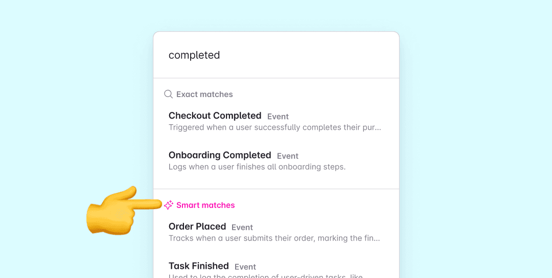 Smart Search makes discovering items in your tracking plan a breeze. It goes beyond exact matches to provide smarter, AI-powered suggestions. Search for terms like “completed” and get results such as “Order Placed” or “Task Finished”.